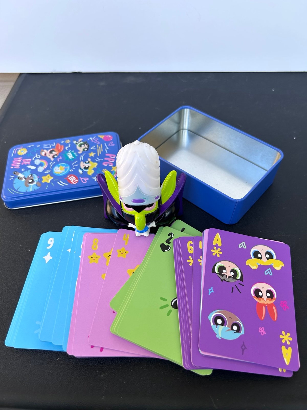 Pre-owned in good condition. Cards are complete, tin has light surface wear. Mojo Jojo shows minor play wear — see photos.