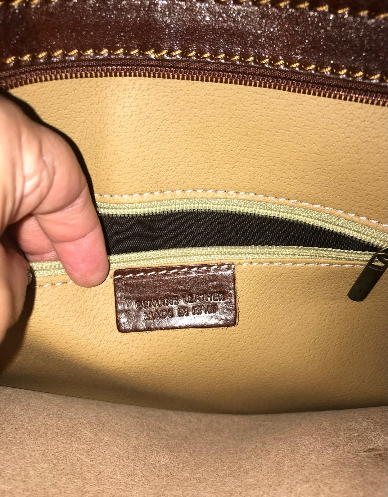 Made in Italy beautiful heavy brown leather 3 compartment bag, perfect for college student or high school, has center zip pocket and 2 other Lined sections be has pencil and glass holder and phone pouch. Smells incredible. Has an extra long strap for comfortable carrying. Measures 14” wide by 11 high with a 16” strap, the leather is impeccable, no scratches or scuffs.