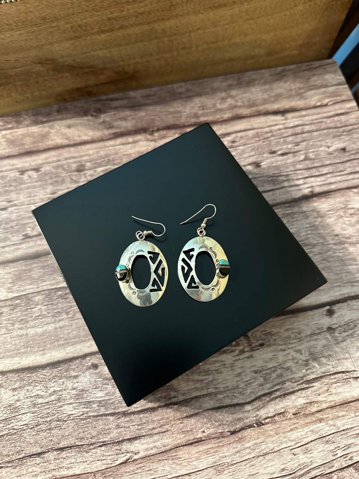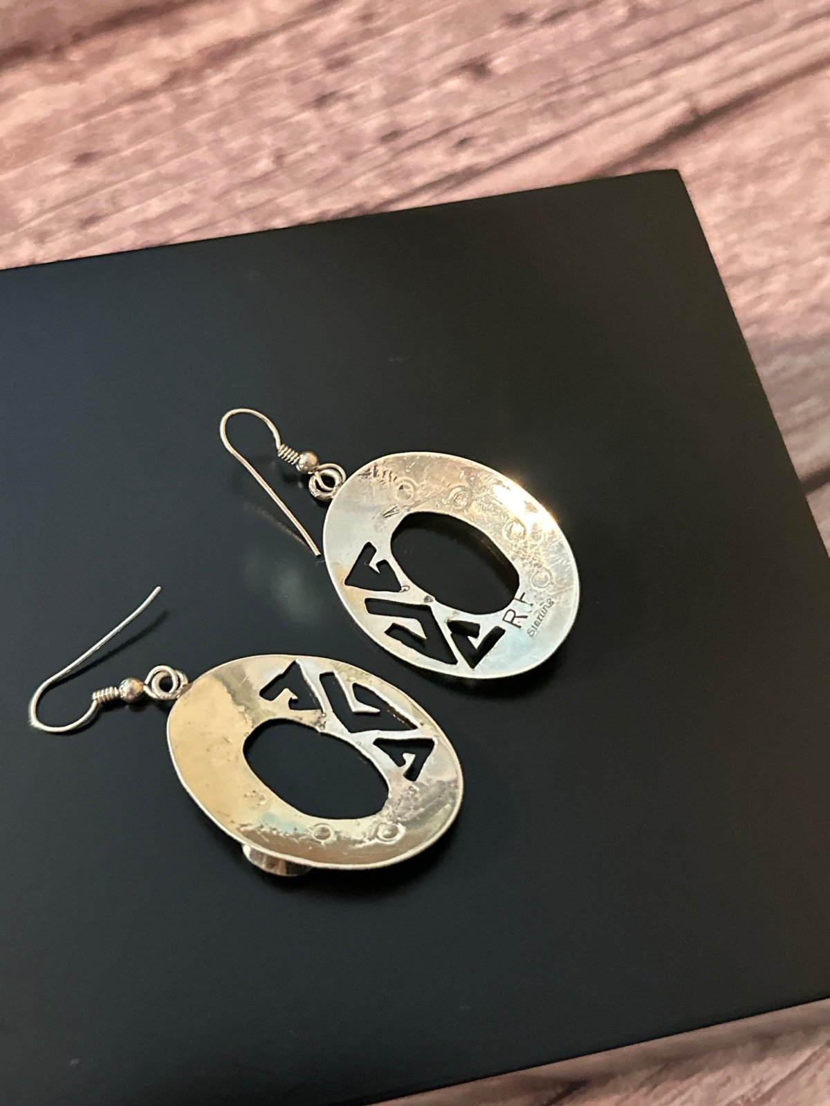 Sterling oval has cut out and stamped design around perimeter of earrings.