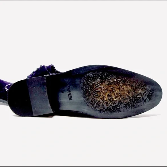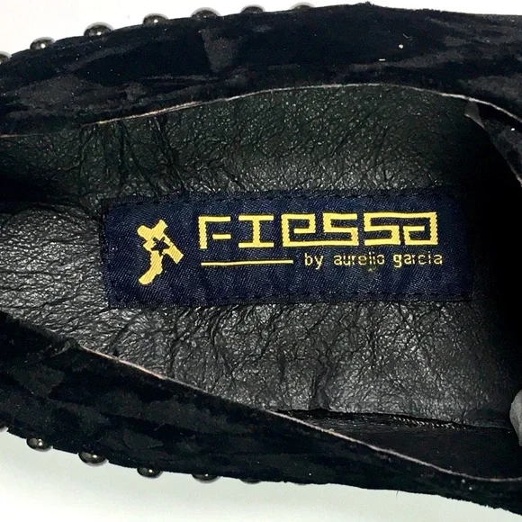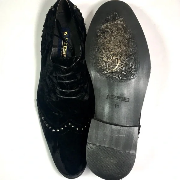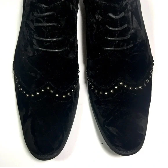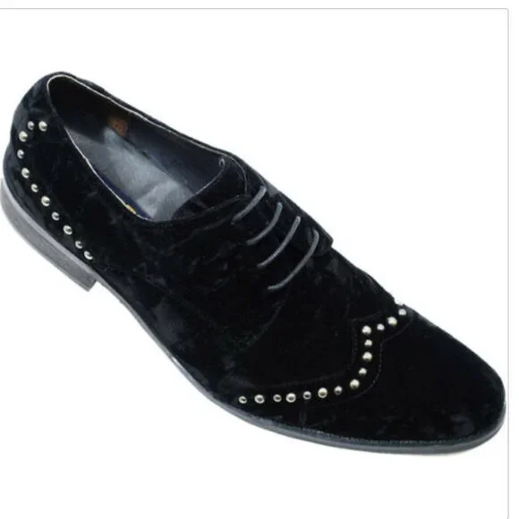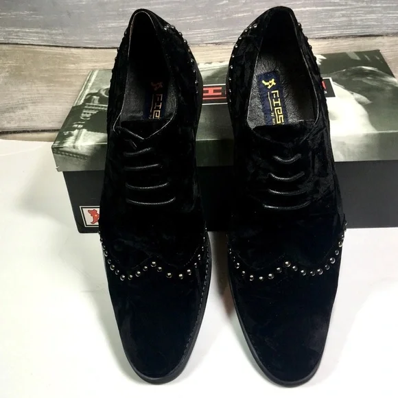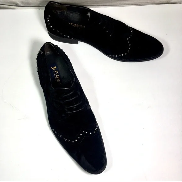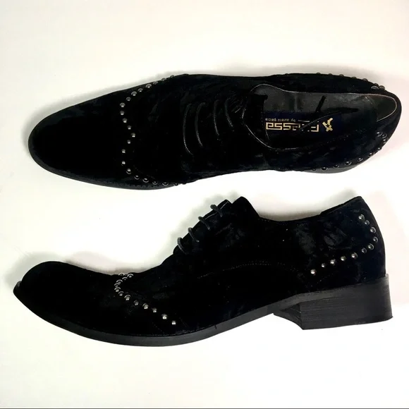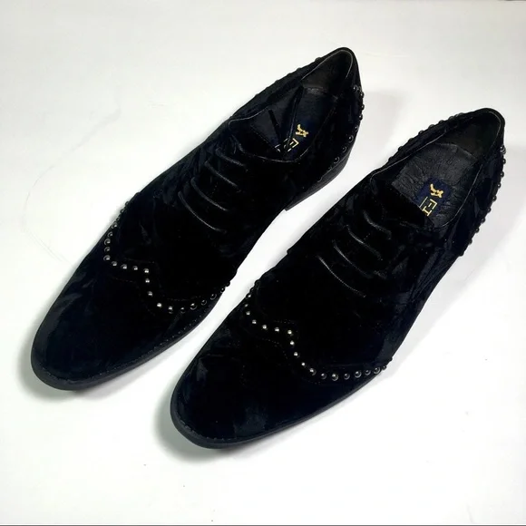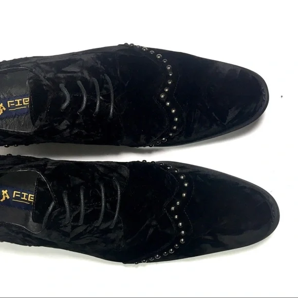 FIESSO by Aurelio Garcia black crushed velvet bronze studded lace up wing tip oxfords, almond toe, genuine leather uppers, leather lining, cushioned footbed, slip resistant heel, tooled floral design synthetic sole. Updated classic shoe with a cool attitude and flair! Stunning, hand sewn designer shoesBrand new in boxMen's size 11Bundle and save! Always speedy shippingFIESSO by Aurelio Garcia designer handcrafted black velvet bronze studded wing tip oxford derby lace up shoes men's size 11